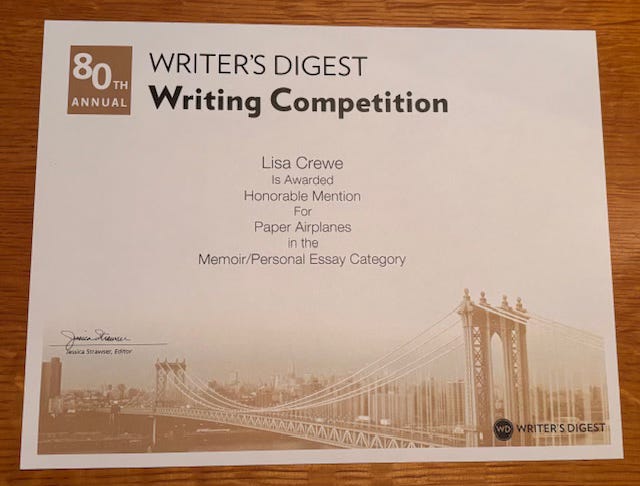 Imagine my surprise when I opened the email from Jessica Strawser, the editor of Writer’s Digest magazine, informing me that I’d won 61st place in the Memoir/Personal Essay division of their contest! I was at my desk at school and it was the end of the day. I ran down the stairs to the office in a blur, excited to tell my friend Shawne, who was a great supporter of my writing. We shrieked!